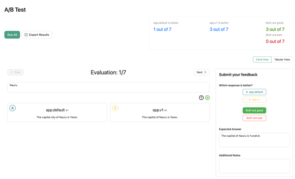 A/B testing lets you compare two versions of your application side-by-side. For each test case, you choose which version performs better.