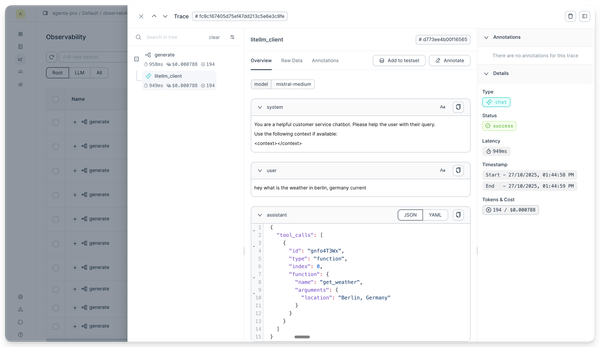 Observability is the practice of monitoring and understanding the behavior of your LLM application. With Agenta, you can add a few lines of code to start tracking all inputs, outputs, and metadata of your application.
